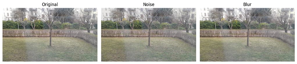 Der Grund liegt in der Bildcharakteristik selbst. Die Szene enthält viele feine Details – etwa Blätter, Äste und komplexe Texturen –, die sowohl durch Rauschen als auch durch Unschärfe stark beeinträchtigt werden. Während Rauschen die Pixelwerte zufällig verändert, führt Blur dazu, dass genau diese feinen Strukturen geglättet und teilweise vollständig entfernt werden.